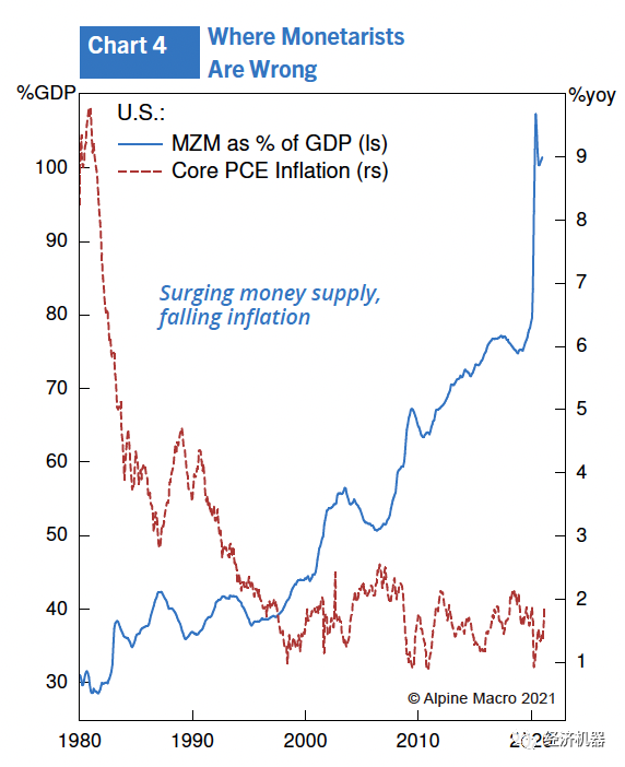 在20世紀(jì)80年代的大部分時(shí)間里,貨幣供應(yīng)量(MZM)強(qiáng)勁增長(zhǎng)(圖4)。米爾頓·弗里德曼的貨幣主義思想仍然很流行。在整個(gè)1980年代,對(duì)通脹的擔(dān)憂仍然普遍存在。然而,該模型存在嚴(yán)重缺陷,因?yàn)樽晕譅柨藭r(shí)代以來(lái),貨幣流通速度穩(wěn)步下降,吸收了大部分貨幣供應(yīng)的增長(zhǎng)。