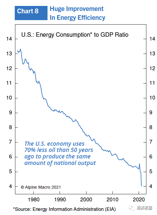 隨著美國(guó)經(jīng)濟(jì)石油需求密集度的急劇下降(圖8),不可能出現(xiàn)上世紀(jì)70年代那樣的重大石油沖擊。如果非要說(shuō)有什么影響的話,隨著經(jīng)濟(jì)的脫碳進(jìn)程和科技不斷降低綠色替能源的成本,油價(jià)可能會(huì)承受更大的通縮壓力。任何綠色能源的狂熱都意味著該行業(yè)獲得資本的途徑似乎是無(wú)限的,這業(yè)必將增加替代能源的供應(yīng)。