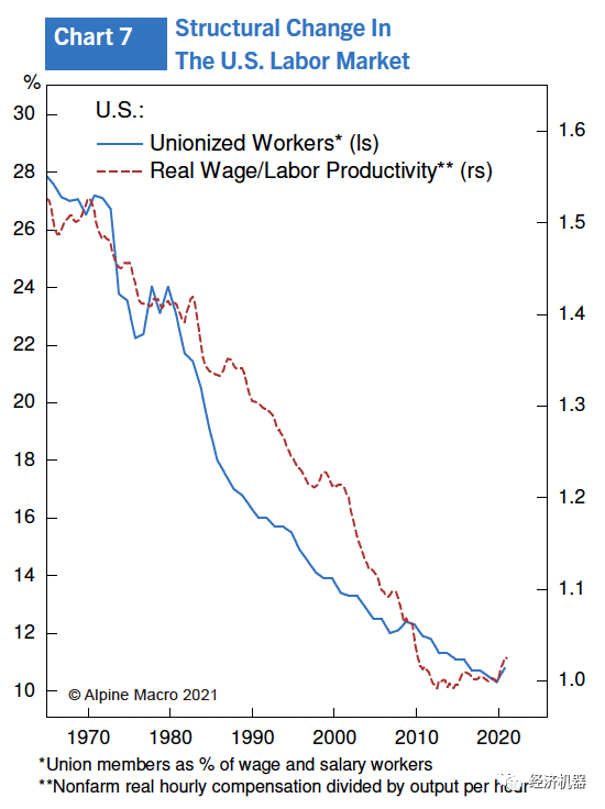 (3) 當(dāng)時(shí)加入工會(huì)的工人數(shù)量占勞動(dòng)力的25%,現(xiàn)在約占10%。工會(huì)引入剛性工資,同時(shí)降低勞動(dòng)生產(chǎn)率(圖7)。在70年代和80年代,剛性工資是導(dǎo)致勞動(dòng)力價(jià)格螺旋上升的一個(gè)關(guān)鍵原因。今天,美國(guó)的大多數(shù)工人不僅要相互競(jìng)爭(zhēng)工作,而且由于全球化的影響,還必須直接或間接地與低工資國(guó)家的工人競(jìng)爭(zhēng)。平均工資率很難持續(xù)超過(guò)勞動(dòng)生產(chǎn)率的水平。