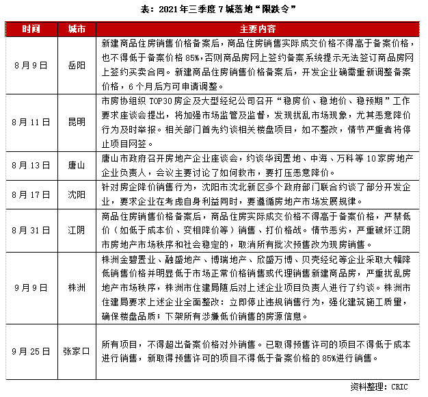 出于穩房價、穩預期的需要,岳陽、昆明等7城相繼落地“限跌令”。其中,岳陽、江陰明文規定禁止大幅降價,昆明、唐山、沈陽、株洲采取約談的方式,禁止房企、中介機構惡意降價、打價格戰,擾亂房地產市場秩序。