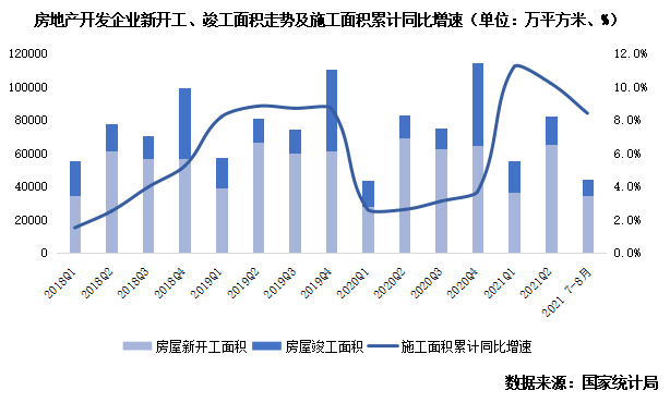 據國家統計局數據:1—8月,房屋新開工面積135502萬平方米,下降3.2%。房屋竣工面積46739萬平方米,增長26.0%。受房屋新開工面積走低影響,1-8月房屋施工面積同比增速收窄至8.4%。