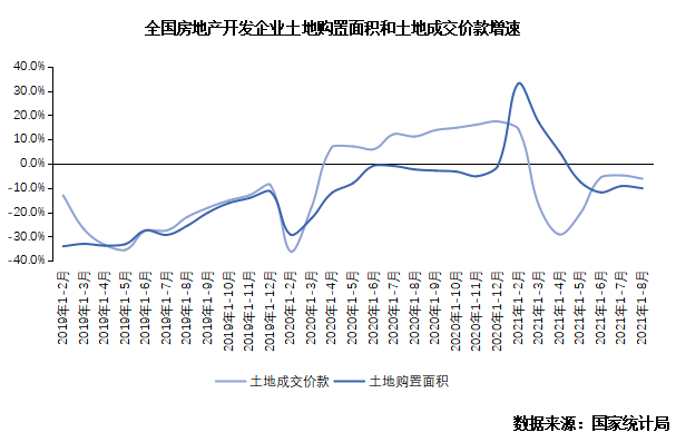 據國家統計局數據:1—8月,房地產開發企業土地購置面積10733萬平方米,同比下降10.2%;土地成交價款6647億元,下降6.2%;二者較1-6月降幅分別擴大1.7PCT和0.6PCT。三季度整體土地市場進一步降溫,房企土地購置面積和成交價款進一步走低。