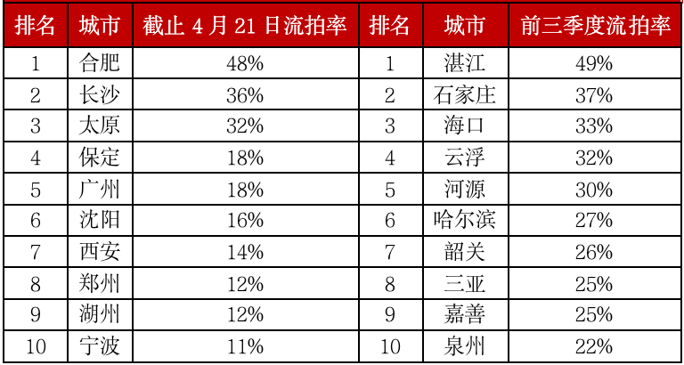 前三季度,流拍率TOP10城市分別為:湛江、石家莊、海口、云浮、河源、哈爾濱、韶關、三亞、嘉善和泉州,與2020年4月統計時的流拍率TOP10城市重合度較低。