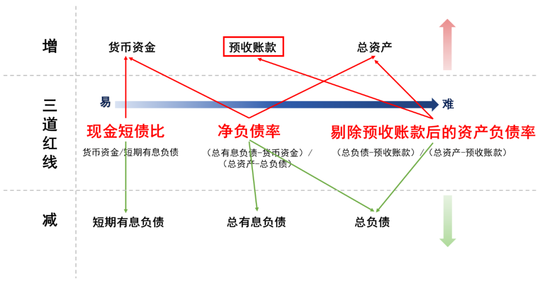 事實上,房企降檔之所以呈現“現金短債比-凈負債率-剔除預收款后的資產負債率”這樣的順序,主要與指標改善的難易程度掛鉤。