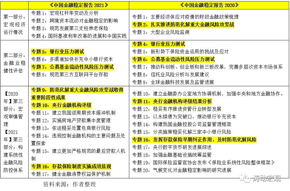 (三)2020年與2021年金融穩定報告分別有20個主題和17個主題,其中有5個主題基本是相同的,即銀行業壓力測試、公募基金流動性風險壓力測試、央行金融機構評級結果分析、防范化解重大金融風險和存款保險。