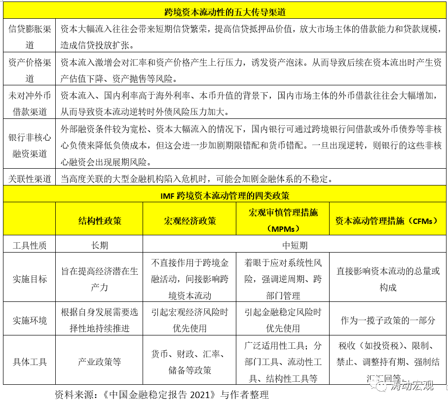 在金融雙向開放步伐不斷加快的背景下,短期跨境資本逐利性、易超調和順周期性等特點很容易刺激金融機構過度承擔風險、加劇金融體系脆弱性、放大宏觀經濟波動,而央行和外管局近年亦均特別強調突出跨境資本流動可能帶來的風險防范問題(詳情請參見央行和外管局2021年度會議釋放哪些信號?),并于2017年提出了“宏觀審慎+微觀監管”兩位一體的跨境資本流動宏觀審慎管理框架。鑒于此,《中國金融穩定報告2021》亦專門討論“跨境資本流動對金融穩定的影響”。
