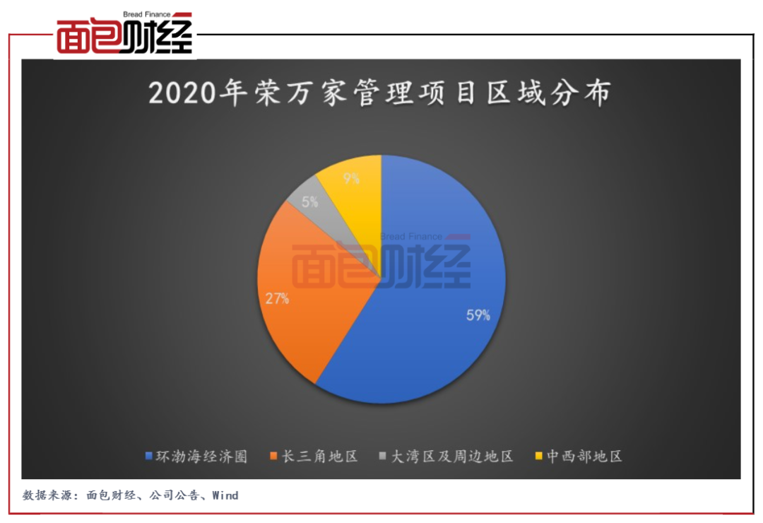 在管項(xiàng)目區(qū)域的分布上,按在管項(xiàng)目收入計(jì)算,榮萬家環(huán)渤海經(jīng)濟(jì)圈占58.9%、長(zhǎng)三角地區(qū)占27%、大灣區(qū)(包括其周邊地區(qū))占5%、中西部地區(qū)占9%。