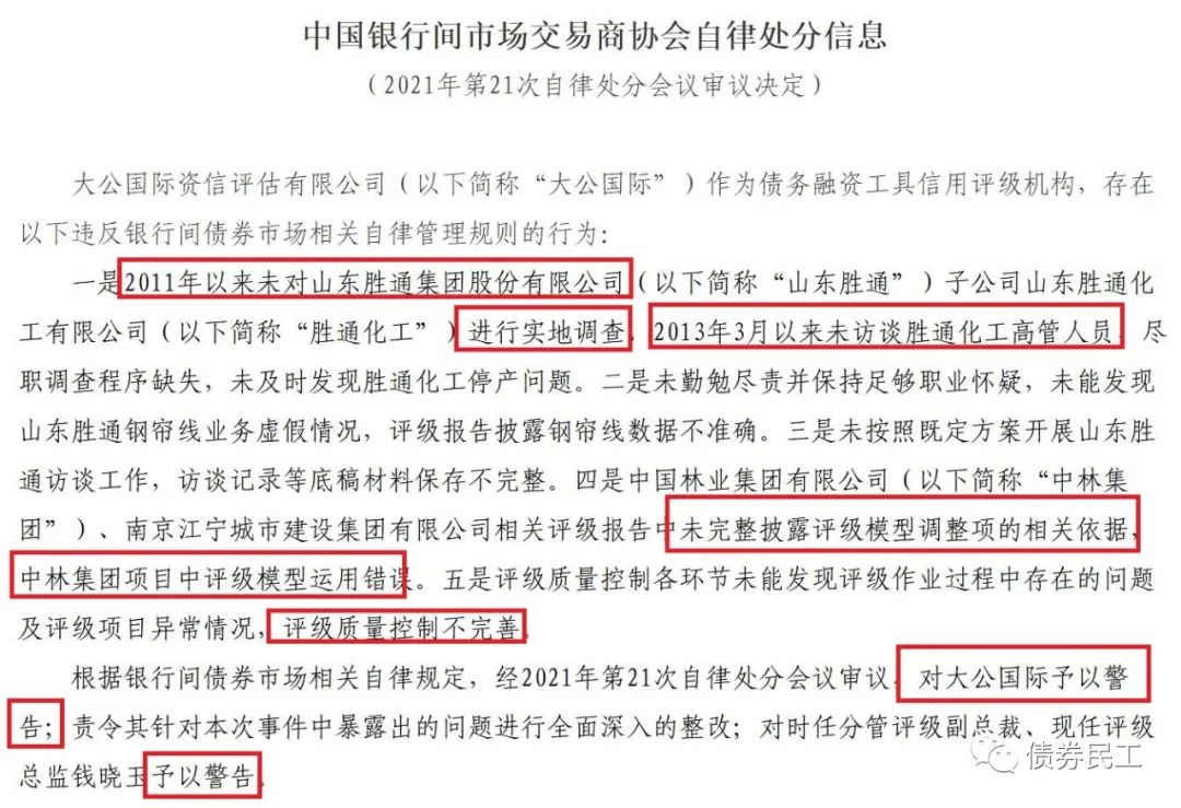 根據(jù)中國銀行間市場交易商協(xié)會2021年12月16日的公告信息,大公國際資信評估有限公司因為個別項目中存在盡職調(diào)查程序缺失、未勤勉盡責(zé)、未披露評級模型調(diào)整項的依據(jù)以及評級質(zhì)量控制不完善等問題,被予以警告。