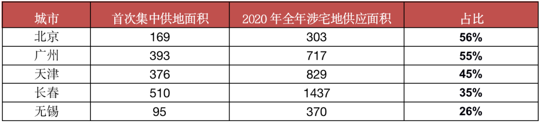 表:重點(diǎn)城市首批集中供地規(guī)模與2020年供地規(guī)模比較(萬(wàn)平方米)