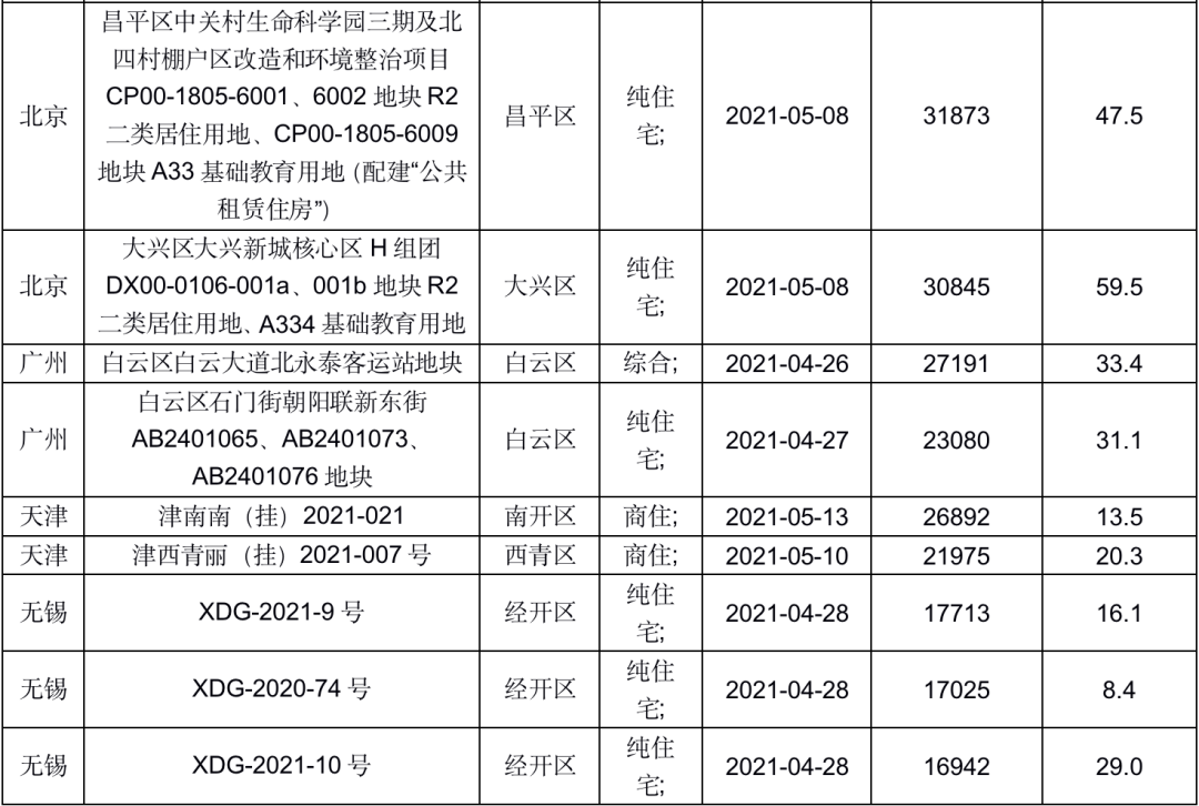 我們認(rèn)為,接下來(lái)的土拍焦點(diǎn)將集中在北京、廣州、天津、無(wú)錫、紹興、義烏、溫州等城市;尤其是北京,起拍價(jià)超過(guò)3萬(wàn)元/平方米的土地就有16宗之多,其中不乏海淀樹(shù)村、金盞鄉(xiāng)小店村這種起拍價(jià)超過(guò)5萬(wàn)/平方米的優(yōu)質(zhì)地塊,未來(lái)土拍熱度也或?qū)⒃谶@些優(yōu)質(zhì)地塊的帶領(lǐng)下顯著升溫。