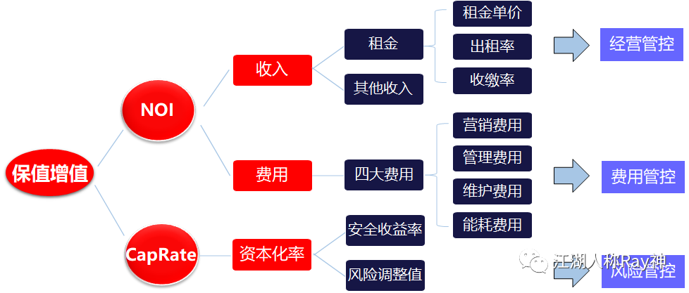 當然,對許多地方性國企來說也許租金收益不是他們的目標;但需要思考的是,他們是否承載著實現國有資產保值增值、實現盤活低效資產的職責。而這些方面,同樣也是離不開做好項目運營,離不開做好現金流管理的。因為,盤活低效資產必須通過運營手段來讓資產得到有效利用,而保值增值則是需要讓資產產生得到市場認可的價值——遵循市場規律,就需要通過運營收益來撬動資產價值,即:資產價值(V)=凈營業收入(NOI)/資本化率(CapRate)。