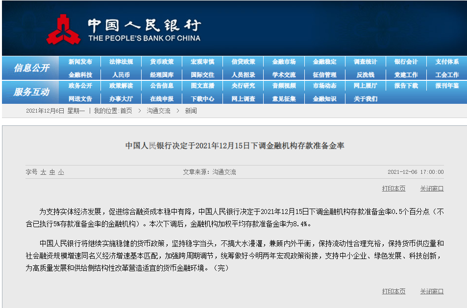周一17:00:00,央行官網整點掛出了下調金融機構存款準備金率的新聞。