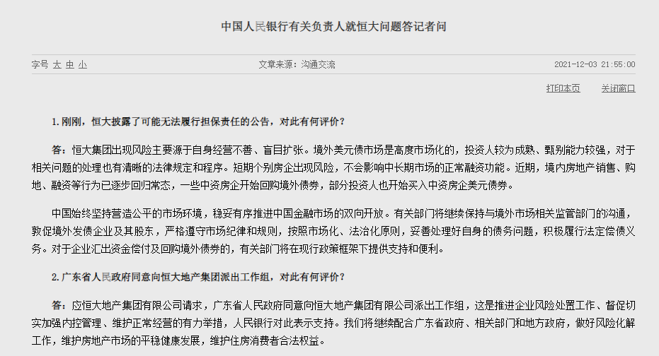 在上一個工作日的晚上,也就是恒大違約公告的當晚,央行官網就專門發布了央行有關負責人對恒大問題的看法,并明確提到: