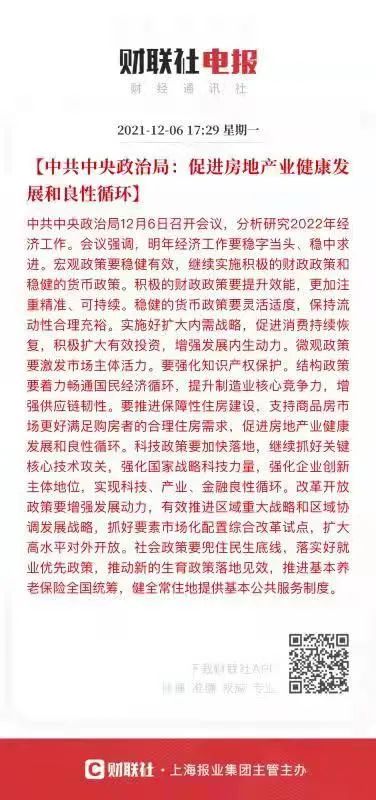 今天中央 ZZ 局召開會議,分析研究2022年經濟工作。會議強調,要推進保障性住房建設,支持商品房市場更好滿足購房者的合理住房需求,促進房地產業健康發展和良性循環。