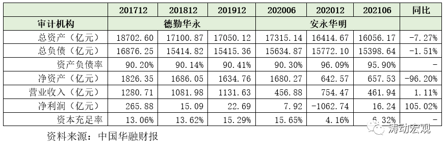 1、2018年以來,華融資產(chǎn)開始進(jìn)入縮表模式,總資產(chǎn)由2017年底的1.87萬億降至今年6月底的1.61萬億(收窄0.26萬億)。與之相對應(yīng),華融資產(chǎn)的凈資產(chǎn)亦從2018年的1826億元大幅降至今年6月底的658億元(收窄1168億元),資產(chǎn)負(fù)債率亦大幅升至96%附近,雖然金融資產(chǎn)管理公司的資產(chǎn)負(fù)債率本身就很高(一般在85-90%左右),但比商業(yè)銀行還要高,這著實難以理解。