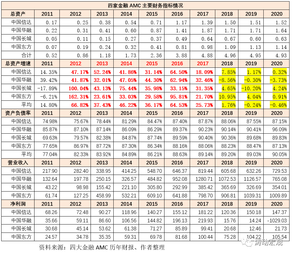 華融資產(chǎn)的問題并不是孤立的,實際上這幾年四大AMC多多少少都放慢了擴(kuò)張步伐。例如,2017-2020年期間,信達(dá)資產(chǎn)的總資產(chǎn)增速分別為18.09%、7.85%、1.17%和0.32%,華融資產(chǎn)的總資產(chǎn)增速分別為32.46%、-8.56%、-0.30%和-3.73%,長城資產(chǎn)的總資產(chǎn)增速分別為31.35%、4.65%、-10.20%和4.24%,東方資產(chǎn)的總資產(chǎn)增速分別為21.70%、10.95%、4.04%和0.91%。相較于2012-2017年期間的擴(kuò)張力度,2018年以來四大AMC的問題開始不斷出現(xiàn),風(fēng)險持續(xù)暴露。