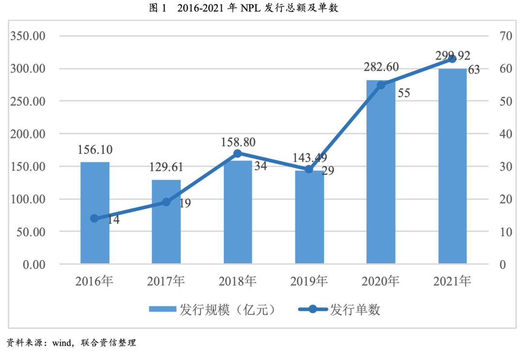 2016年至2021年,不良資產(chǎn)證券化產(chǎn)品(以下簡稱“NPL”)累計(jì)發(fā)行規(guī)模為1170.54億元。繼2020年不良資產(chǎn)證券化產(chǎn)品發(fā)行量大幅提升后,2021年,銀行間公募市場(chǎng)共發(fā)行63單不良資產(chǎn)證券化產(chǎn)品,較上年增加8單,發(fā)行規(guī)模達(dá)299.92億元,同比增長6.13%,發(fā)行規(guī)模穩(wěn)中有升。