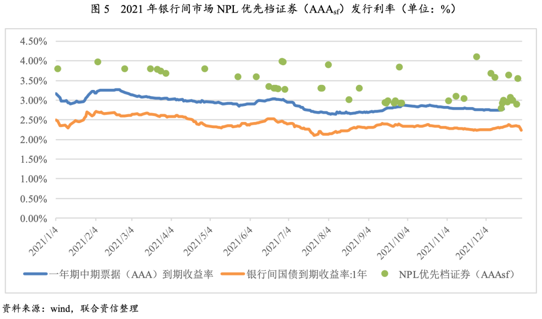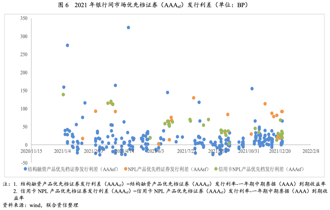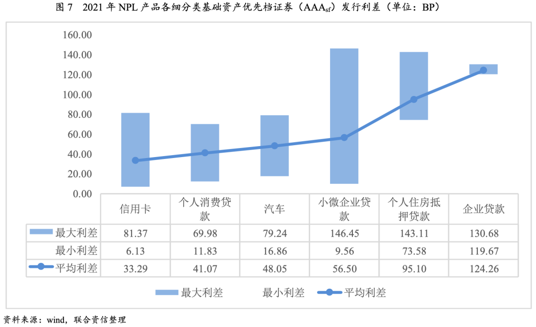 2021年,NPL優(yōu)先檔證券(AAAsf)發(fā)行利率高于一年期中期票據(jù)(AAA)發(fā)行利率6.13-146.45BP。其中,基礎(chǔ)資產(chǎn)為信用卡、個(gè)人消費(fèi)型NPL產(chǎn)品,優(yōu)先檔證券(AAAsf)發(fā)行利差較小,為6.13-81.37BP,平均利差34.35BP;基礎(chǔ)資產(chǎn)為企業(yè)貸款的發(fā)行利差最大,為119.67-130.68BP,平均利差124.26BP。