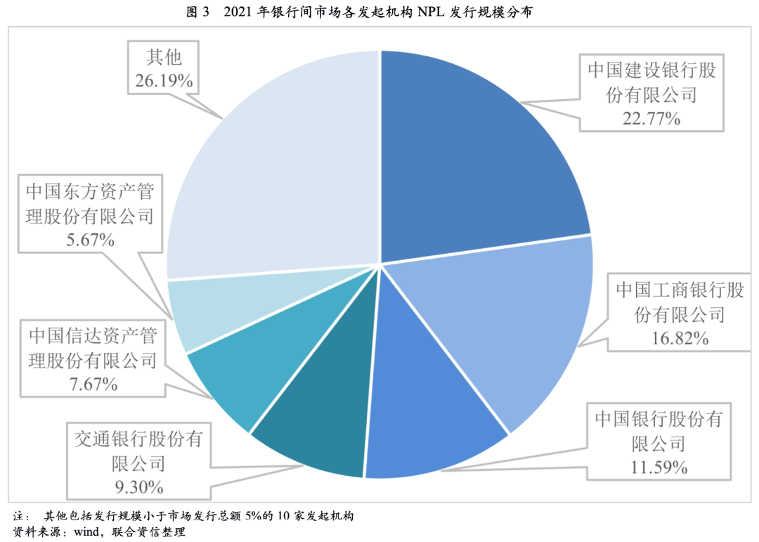 大型國有商業(yè)銀行為銀行間公募市場(chǎng)NPL產(chǎn)品發(fā)行主力,其中發(fā)行量排名前三的是建設(shè)銀行、工商銀行和中國銀行,共發(fā)行153.50億元,占2021年不良資產(chǎn)證券化產(chǎn)品總發(fā)行規(guī)模51.18%。隨著2019年底,第三次不良資產(chǎn)證券化試點(diǎn)擴(kuò)容,2020年以來,銀行間公募市場(chǎng)發(fā)起機(jī)構(gòu)更趨多元化,發(fā)起機(jī)構(gòu)新增資產(chǎn)管理公司和城市商業(yè)銀行。2021年,資產(chǎn)管理公司和城市商業(yè)銀行共發(fā)起3單NPL產(chǎn)品。