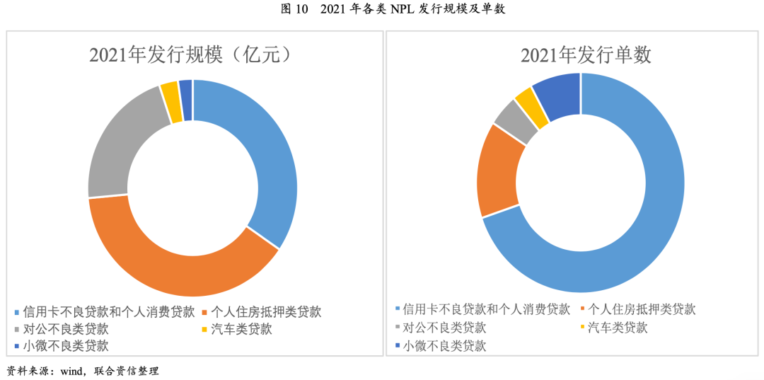 2021年發(fā)行的NPL產(chǎn)品中有44單以信用卡不良貸款和個(gè)人消費(fèi)貸款為基礎(chǔ)資產(chǎn),證券發(fā)行規(guī)模合計(jì)為103.51億元,占NPL總發(fā)行規(guī)模的34.51%,涉及不良貸款本息費(fèi)達(dá)1185.68億元。