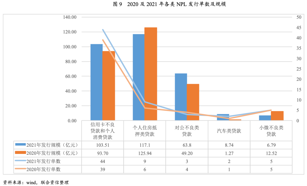 2021年共發(fā)行63單NPL產(chǎn)品,涵蓋信用卡不良貸款、個(gè)人消費(fèi)貸款、汽車類貸款、個(gè)人住房抵押類貸款、小微不良類貸款和對(duì)公不良類貸款等六種類型,其中基礎(chǔ)資產(chǎn)類型以信用卡不良貸款、個(gè)人消費(fèi)貸款、個(gè)人住房抵押貸款為主。2021年,從發(fā)行單數(shù)和規(guī)模看,信用卡、消費(fèi)貸不良貸款NPL的發(fā)行單數(shù)和規(guī)模均有所上升;個(gè)人住房抵押類貸款、對(duì)公不良類貸款NPL的發(fā)行單數(shù)和規(guī)模與上年基本持平;小微不良類貸款NPL發(fā)行單數(shù)與上年持平,發(fā)行規(guī)模較上年有所下滑;汽車類貸款NPL作為2020年新增的NPL產(chǎn)品,2020年發(fā)行一單,2021年發(fā)行兩單。具體發(fā)行單數(shù)及規(guī)模詳見下圖。