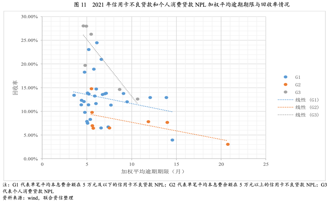 由于信用卡和消費(fèi)類貸款一般無抵質(zhì)押物作為擔(dān)保,回收難度較大,從進(jìn)入不良到初始起算日的逾期期限和資產(chǎn)池分散度對(duì)回收水平的影響較大,逾期期限越短,分散度越高,回收率越高。如下圖所示,個(gè)人消費(fèi)貸款NPL的分散度高于信用卡NPL,相似逾期期限的資產(chǎn)池,個(gè)人消費(fèi)貸款NPL回收率更高。具有相似逾期期限的信用卡不良貸款,分散度越高(筆均5萬以下)的資產(chǎn)池回收率越高。分散度相近的信用卡不良貸款,逾期期限越短,回收率越高。