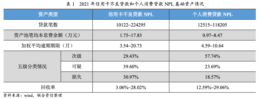 從五級(jí)分類情況來看,信用卡不良貸款NPL可疑類占比略高于次級(jí)類和損失類。從估值來看,2021年發(fā)行的此類NPL的單筆平均本息費(fèi)余額區(qū)間為1.75萬元至17.83萬元,分散性好,基礎(chǔ)資產(chǎn)同質(zhì)性高;最小加權(quán)平均逾期期限為3.54個(gè)月,最大加權(quán)平均逾期期限為20.73個(gè)月,入池資產(chǎn)逾期期限較短。2021年發(fā)行的信用卡和消費(fèi)類NPL基礎(chǔ)資產(chǎn)一般情形下的回收率區(qū)間為3.06%至28.02%,回收率均值為11.97%。個(gè)人消費(fèi)貸款NPL的資產(chǎn)池在分散度、逾期期限和五級(jí)分類情況等方面整體優(yōu)于信用卡不良NPL,回收率表現(xiàn)整體優(yōu)于信用卡不良貸款,回收率區(qū)間為12.59%至29.06%,回收率均值為21.79%。