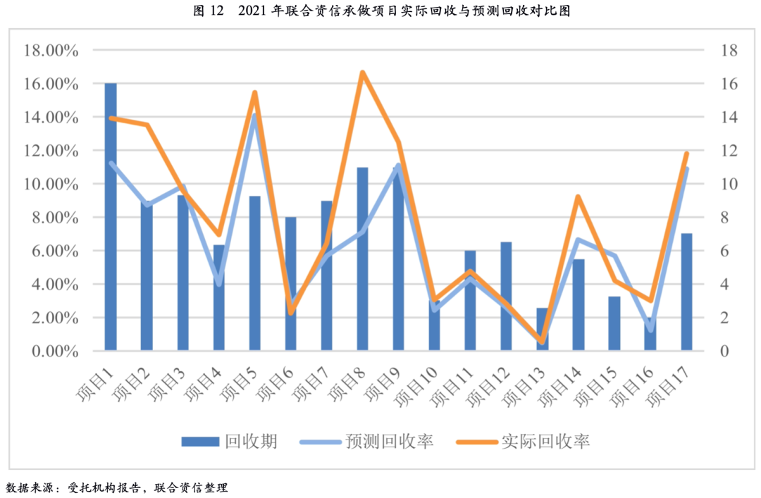 以2021年新發(fā)行不良ABS項(xiàng)目為例,截至2021年底,本年度新發(fā)行的不良ABS項(xiàng)目中,由聯(lián)合資信承做的27單項(xiàng)目中共17單項(xiàng)目已經(jīng)歷至少1個(gè)回收期。從各回收期間的回收數(shù)據(jù)來看,資產(chǎn)池實(shí)際回收大部分略高于初始預(yù)測(cè),考慮到未來經(jīng)濟(jì)環(huán)境和催收環(huán)境變化的影響,實(shí)際回收基本符合預(yù)期,整體偏差程度不大。