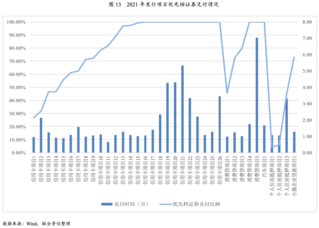 以2021年新發(fā)行不良ABS項(xiàng)目為例,截至2021年底,本年度新發(fā)行的不良ABS項(xiàng)目中,除27單尚未達(dá)到首次支付日的項(xiàng)目以外,有14單項(xiàng)目優(yōu)先檔證券已經(jīng)兌付完畢,其中11單為信用卡不良貸款A(yù)BS,2單為消費(fèi)貸不良貸款A(yù)BS,1單為汽車不良貸款A(yù)BS。優(yōu)先檔證券未完全兌付項(xiàng)目中,有14單項(xiàng)目的優(yōu)先檔證券已兌付50%以上,其中11單為信用卡不良貸款A(yù)BS,2單為消費(fèi)貸不良貸款A(yù)BS,1單為小微企業(yè)不良貸款A(yù)BS;有6單項(xiàng)目的優(yōu)先檔證券兌付20%-50%,其中4單為信用卡不良貸款A(yù)BS,1單為消費(fèi)貸不良貸款A(yù)BS,1單為個(gè)人住房抵押不良貸款A(yù)BS;有2單項(xiàng)目優(yōu)先檔證券兌付低于10%,均為個(gè)人住房抵押不良貸款A(yù)BS。從優(yōu)先檔證券的兌付情況看,信用卡、消費(fèi)貸這類個(gè)人信用類不良貸款A(yù)BS的兌付速度快于有抵押的個(gè)人住房不良貸款A(yù)BS和小微企業(yè)不良貸款A(yù)BS。