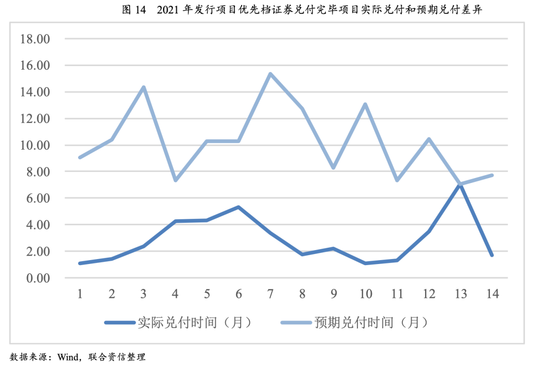 以2021年新發(fā)行不良ABS項(xiàng)目為例,截至2021年底,本年度新發(fā)行且優(yōu)先檔證券已兌付完畢的不良ABS項(xiàng)目中,優(yōu)先檔證券的實(shí)際到期期限絕大多數(shù)短于預(yù)期到期期限,實(shí)際到期日平均早于預(yù)期到期日半年多。