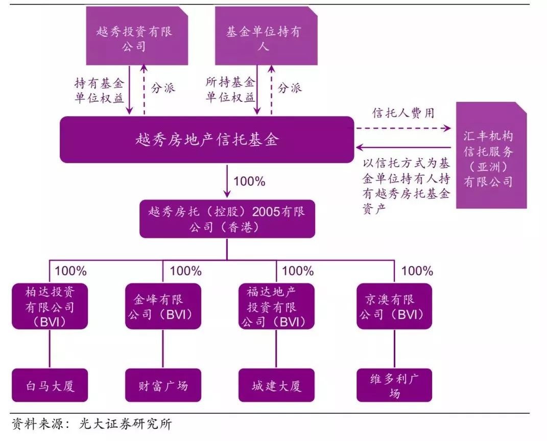 3)設(shè)立地產(chǎn)信托REIT。匯豐機(jī)構(gòu)信托服務(wù)(亞洲)有限公司作為信托人和管理人將越秀房托(控股)2005限公司(香港)間接持有的四項(xiàng)國(guó)內(nèi)物業(yè)資產(chǎn)設(shè)立越秀房地產(chǎn)信托基金金。于2005年12月7日訂立信托契約,成立香港房地產(chǎn)信托基金——越秀房產(chǎn)信托基金。