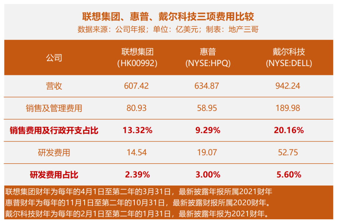聯想的整體銷售費用和管理費用占營業收入的13.3%,這個比例介于惠普和戴爾之間。