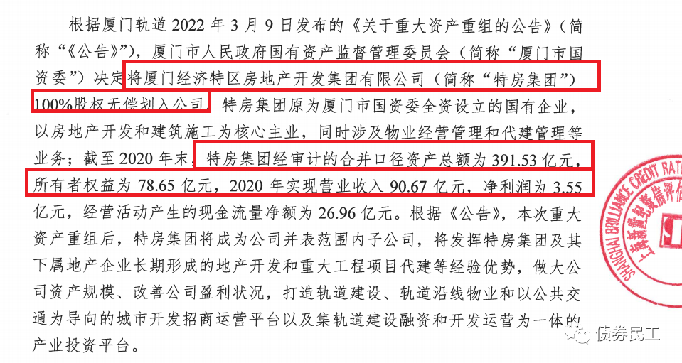 根據上海新世紀評級2022年3月14日披露的《關于廈門軌道交通集團有限公司重大資產重組的關注公告》。廈門經濟特區房地產開發集團有限公司(以下簡稱“廈門特房集團”)劃入廈門軌道交通集團有限公司(以下簡稱“廈門軌道集團”),本次資產劃入事項構成重大資產重組。