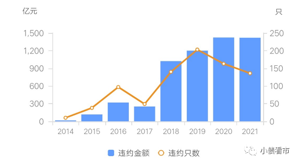 《小債看市》統(tǒng)計(jì),2014-2021年信用債市場(chǎng)共計(jì)發(fā)生債券違約836只,違約金額高達(dá)5766.18億元。