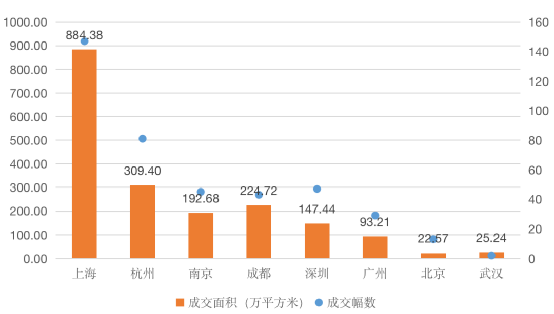 從成交情況來(lái)看,10月,重點(diǎn)22城中武漢、上海、杭州、北京、長(zhǎng)沙五個(gè)城市完成第二批次集中供地,共成交租賃土地62幅,以拿地配建方式為主,總建筑面積累計(jì)約113.25萬(wàn)方,值得一提的是,上海10月出讓租賃用地宗數(shù)和建面居五城之首,共成交租賃用地26宗,成交建面55.56萬(wàn)平方米??硕鹱馐壑攸c(diǎn)監(jiān)測(cè)的核心8城中,上海、杭州、北京、武漢4城成交租賃地塊58幅。