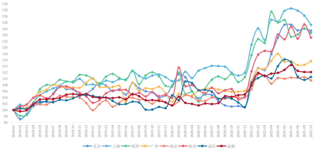 聚焦重點(diǎn)8城,以2018年1月為基期,核心8城租賃價(jià)格指數(shù)出現(xiàn)下降。截至2021年10月,8城市租賃價(jià)格指數(shù)區(qū)間仍然位于97.09-132.5,城市間差異較大。其中,上海租賃市場(chǎng)的發(fā)展的持續(xù)性和穩(wěn)定性最好。受租金調(diào)控影響,北上深杭四城租賃指數(shù)均呈現(xiàn)不同程度的下跌趨勢(shì),而廣州租賃市場(chǎng)近期表現(xiàn)較差,已跌出第一梯隊(duì)。