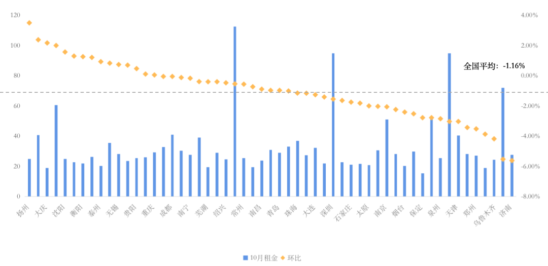 55城個(gè)人房源量?jī)r(jià)齊跌。具體數(shù)據(jù)來(lái)看,10月,55城個(gè)人房源租金為33.32元/平米/月,同比去年上升8.53%,較上月環(huán)比下降1.16%。從城市來(lái)看,10月租金環(huán)比下降的城市多達(dá)40個(gè),超七成城市租金下降,杭州和濟(jì)南環(huán)比降幅最大,均超5%。
