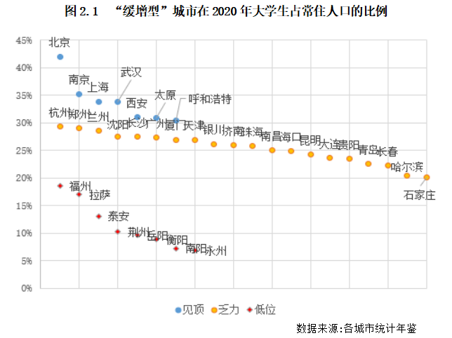 1)“高位見頂”型:大學生占比超過30%的城市,包括北京、南京、上海、武漢、西安、太原及呼和浩特等7個城市。