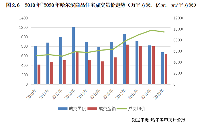 長期來看,哈爾濱、石家莊、岳陽等城市的市場容量將基本出現增長見頂甚至收縮的趨勢。結合人才規模及比例增長來看,這些城市的大學生人口比例長期在低位,近十年漲幅十分有限,這也決定了這些城市多為內生需求為主的城市,在棚改透支當地需求后外來新增需求量少,整體購房需求將出現萎縮。如常住人口較十年前縮減的哈爾濱在2017年后住宅成交面積就持續下滑,至2020年商品住宅成交面積已經降至679.3萬平方米,甚至較2010年下降了16%;房價上漲趨勢也在2020年中止,成交均價較2019年微降了3%。
