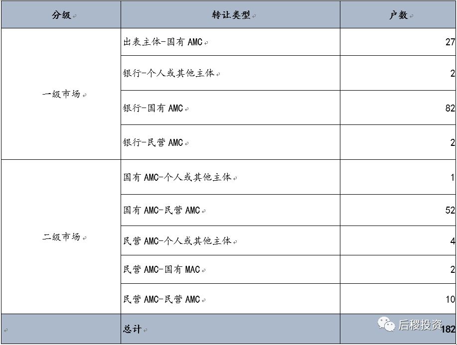 從轉讓戶數角度來看,銀行或出表主體轉出的一手包有342戶,二級市場流轉的資產包戶數有408戶;從轉讓資產金額上來看,一級市場資產總額為79.86億元,二級市場資產總額為110.74億元。另外需要補充說明的是:本次統計四川省2018年度成交公告共計88條,其中債權本金顯示為未透露狀態的有27條,共計182戶沒有資產總額數據,因此保守估計,2018年四川省不良資產的資產總額應在220億以上。該未透露的成交記錄明細如下:
