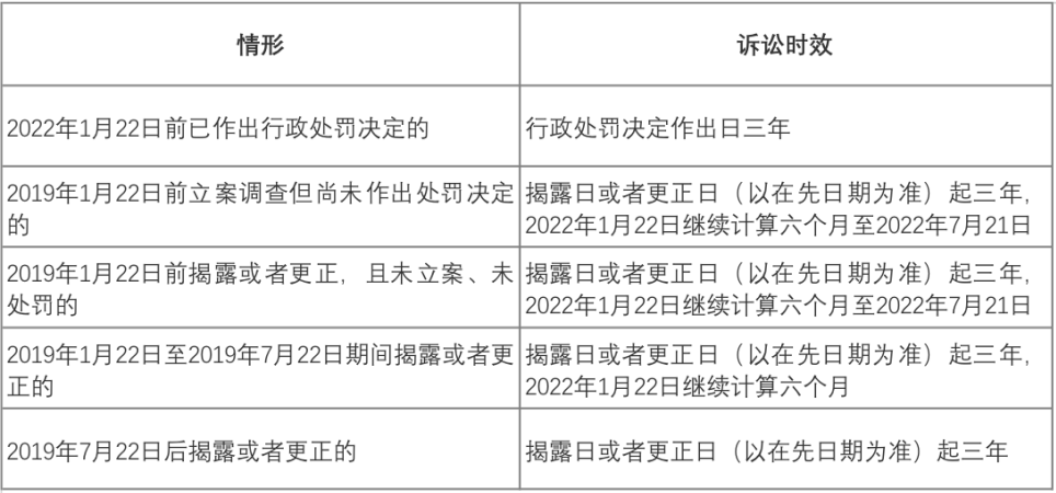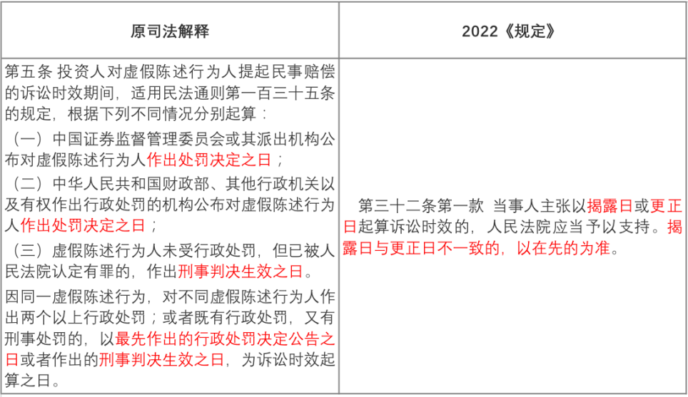 原司法解釋規(guī)定了行政或刑事前置程序,將行政處罰決定作出日或者刑事判決生效日作為訴訟時(shí)效的起算點(diǎn)。在廢除前置程序后,2022《規(guī)定》以揭露日或更正日二者在先日作為訴訟時(shí)效起算點(diǎn),訴訟時(shí)效起算日大幅提前。