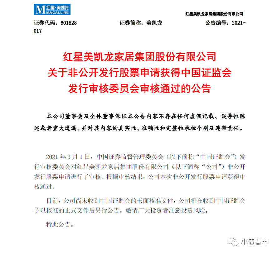3月1日,紅星美凱龍(601828.SH,01528.HK)公告稱,中國證監會發行審核委員會對其非公開發行股票申請進行了審核。根據審核結果,公司本次非公開發行股票申請獲得審核通過。