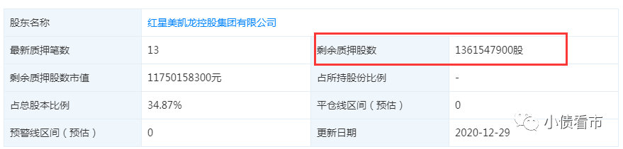 截至2020年末,紅星控股質押紅星美凱龍股份13.62億股,占總股本的34.87%,占其所持股數的49.9%。