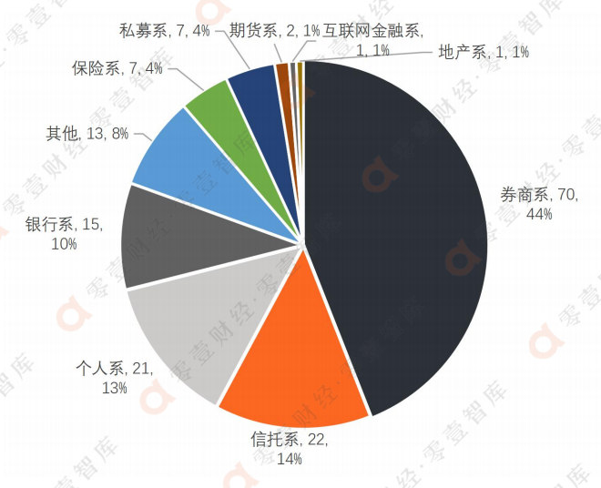 按大股東背景區分,159家公募基金管理人當中,券商系管理人占比近半,而信托系和個人系的占比也相對較高。