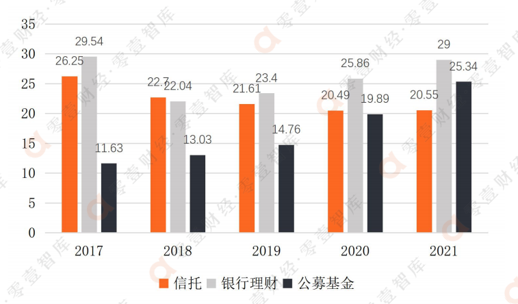 圖:信托、銀行理財、公募基金的管理規模變化趨勢(2017~2021,單位:萬億元)