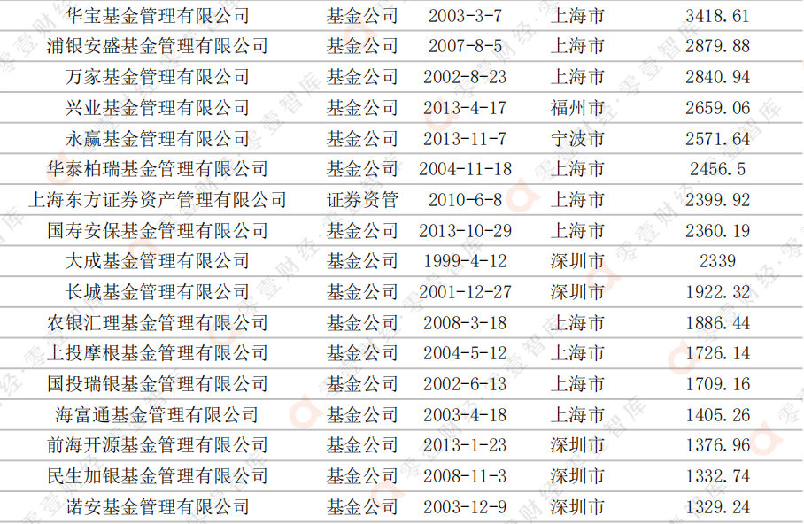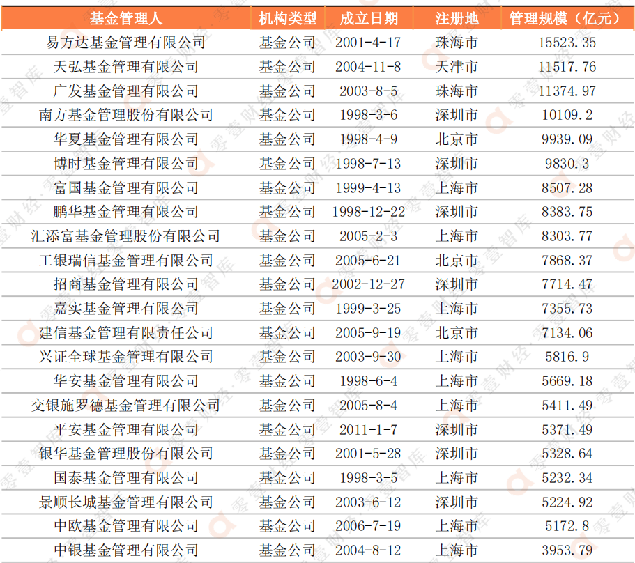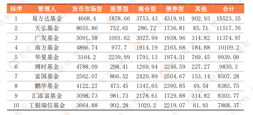 表:全市場基金規模排名前十的管理人