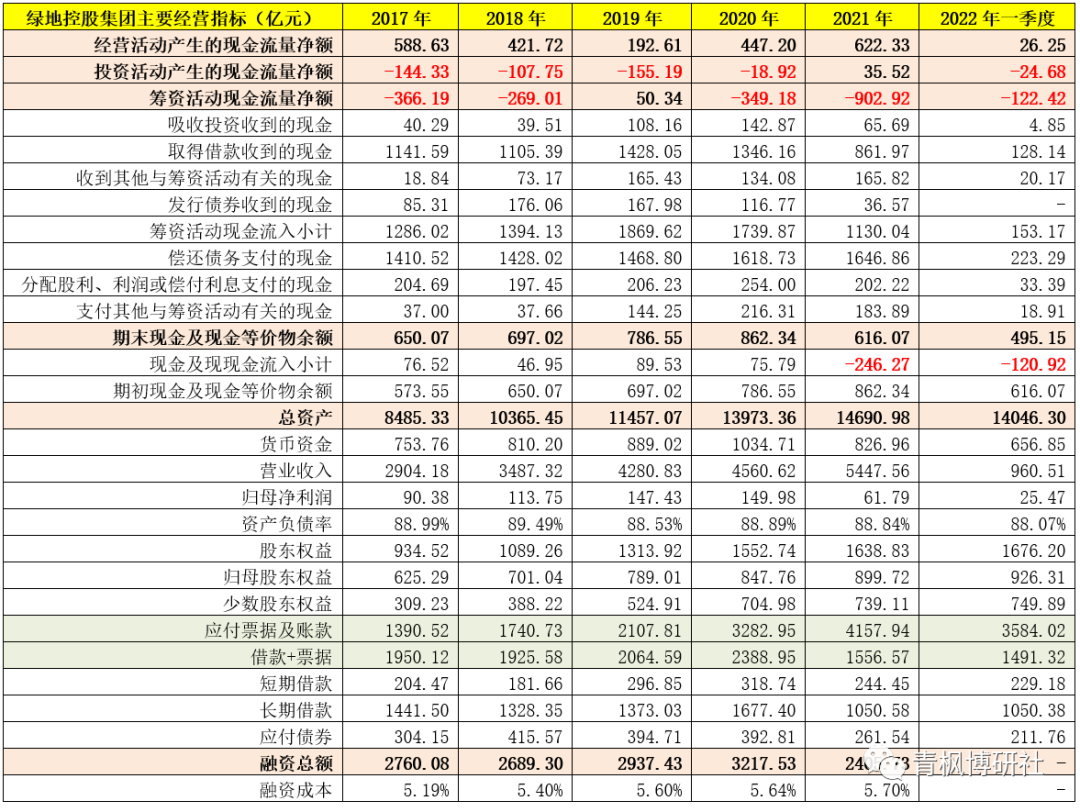 而從數(shù)據(jù)上看,2021年以來(lái)綠地的現(xiàn)金流均處于凈流出的狀態(tài)(2021年全年和2022年一季度分別凈流出246.27億元和120.92億元),這意味著對(duì)于綠地而言,其實(shí)際上已經(jīng)陷入現(xiàn)金流困局。