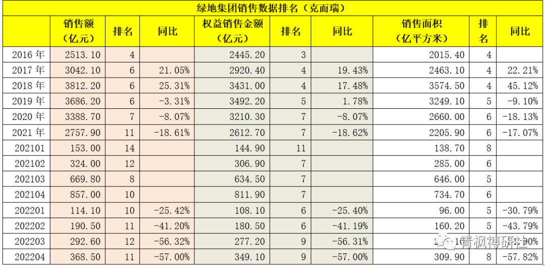 2、從數(shù)據(jù)上看,2019年以來(lái),綠地便開(kāi)始走下坡路。例如,2018年,綠地分別實(shí)現(xiàn)銷售額3812億元、銷售面積3575億平方,同比分別增長(zhǎng)25.31%和45.12%,此后2019-2021年連續(xù)三年,銷售額與銷售面積均持續(xù)下滑。今年前四個(gè)月,綠地分別實(shí)現(xiàn)銷售額369億元、銷售面積 310億平方米,同比分別大幅下滑57%和57.82%,基本處于腰斬的狀態(tài)。