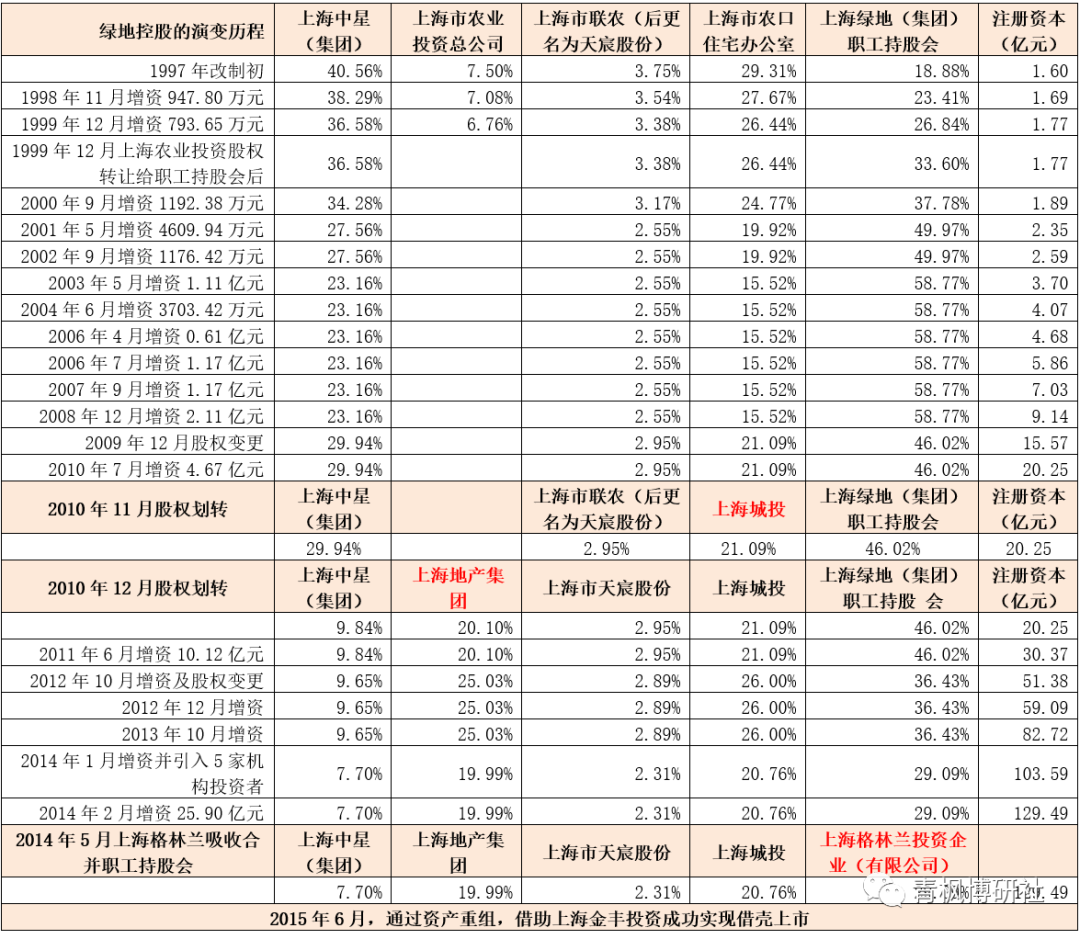2、2013年8月,綠地通過(guò)在香港注冊(cè)的全資子公司,以29.96億港元的對(duì)價(jià)認(rèn)購(gòu)盛高置地增發(fā)的普通股和無(wú)投票權(quán)的可兌換優(yōu)先股。此次交易完成后,綠地將持有盛高地?cái)U(kuò)大股東權(quán)益后的60%的股份,以實(shí)現(xiàn)最終控,隨后將盛高置地更名為綠地香港。在香港上市的做法進(jìn)一步向上海市政府施加了壓力,隨后綠地便趁著全國(guó)國(guó)企改革的春風(fēng),推動(dòng)綠地增資并通過(guò)上海格林蘭投資規(guī)范職工持股會(huì)的運(yùn)作,同時(shí)大幅壓降了上海地產(chǎn)集團(tuán)和上海城投集團(tuán)的持股比例。
