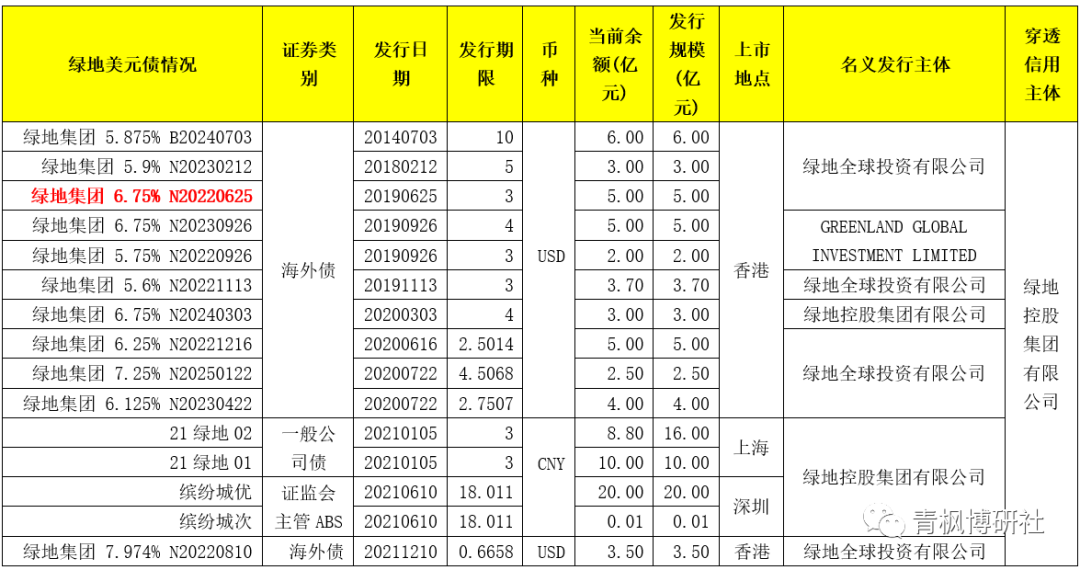 具體看,本次進(jìn)行展期的債券為2019年6月25日發(fā)行、規(guī)模為5億美元、利率為6.75%、到期日為2022年6月月25日。截至目前,綠地系債券還有14只,包括11只海外債(規(guī)模合計(jì)為42.70億億美元)和3只境內(nèi)債券(規(guī)模合計(jì)為24.01億元人民幣)。其中,2022年內(nèi)合計(jì)將到期15.70億美元(6月到期5億美元、9月到期2億美元、11月到期3.70億美元以及12月到期5億美元)。